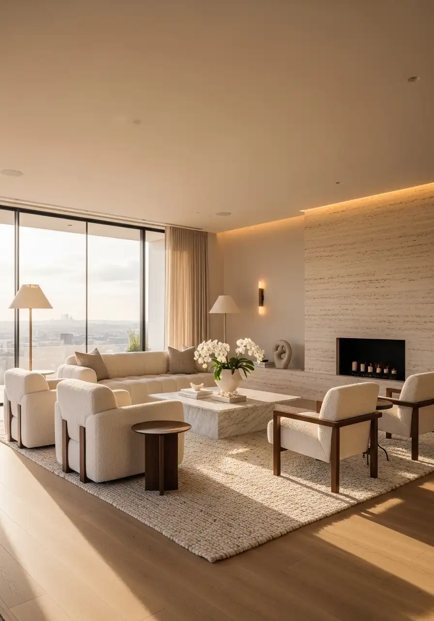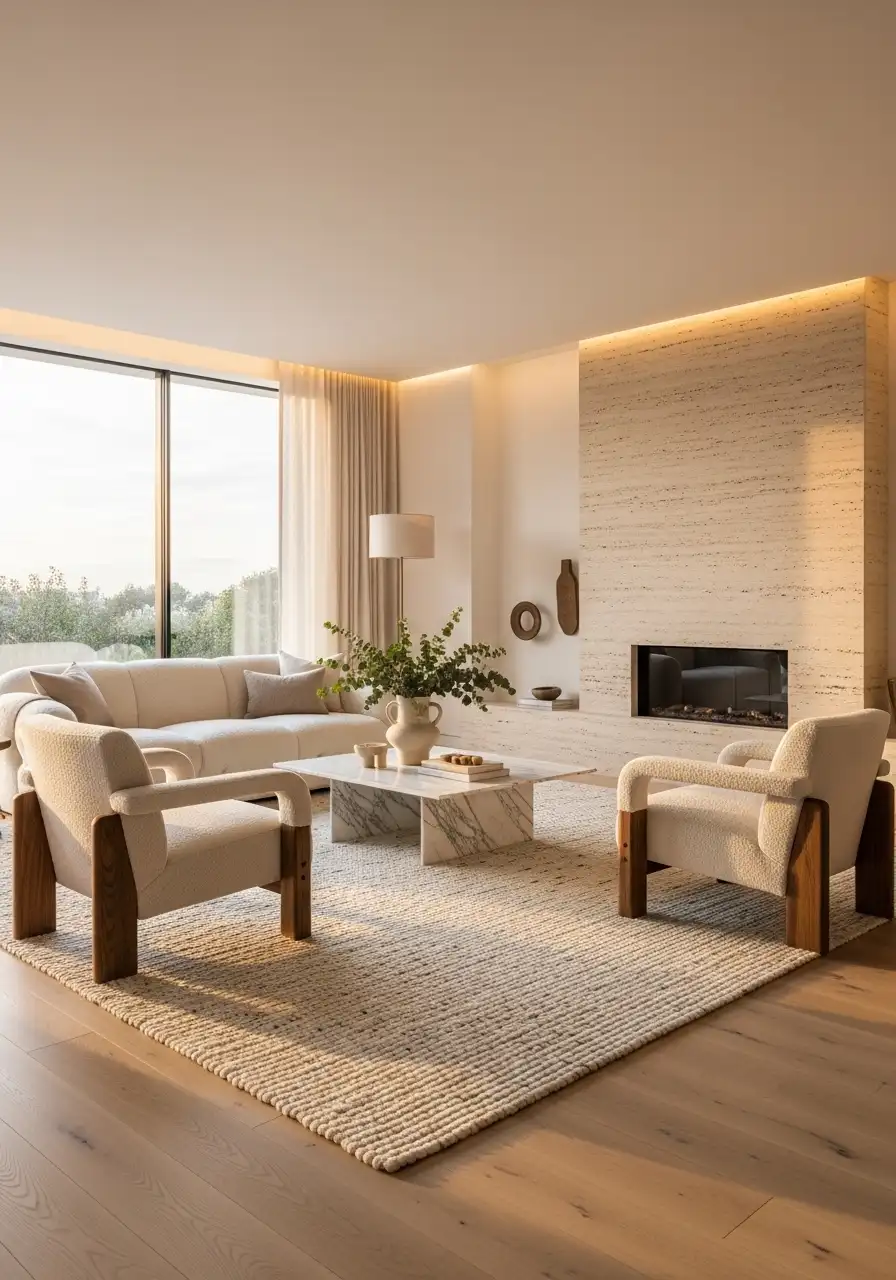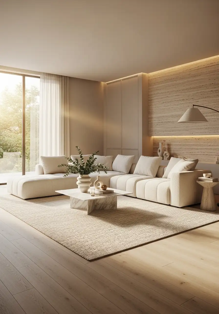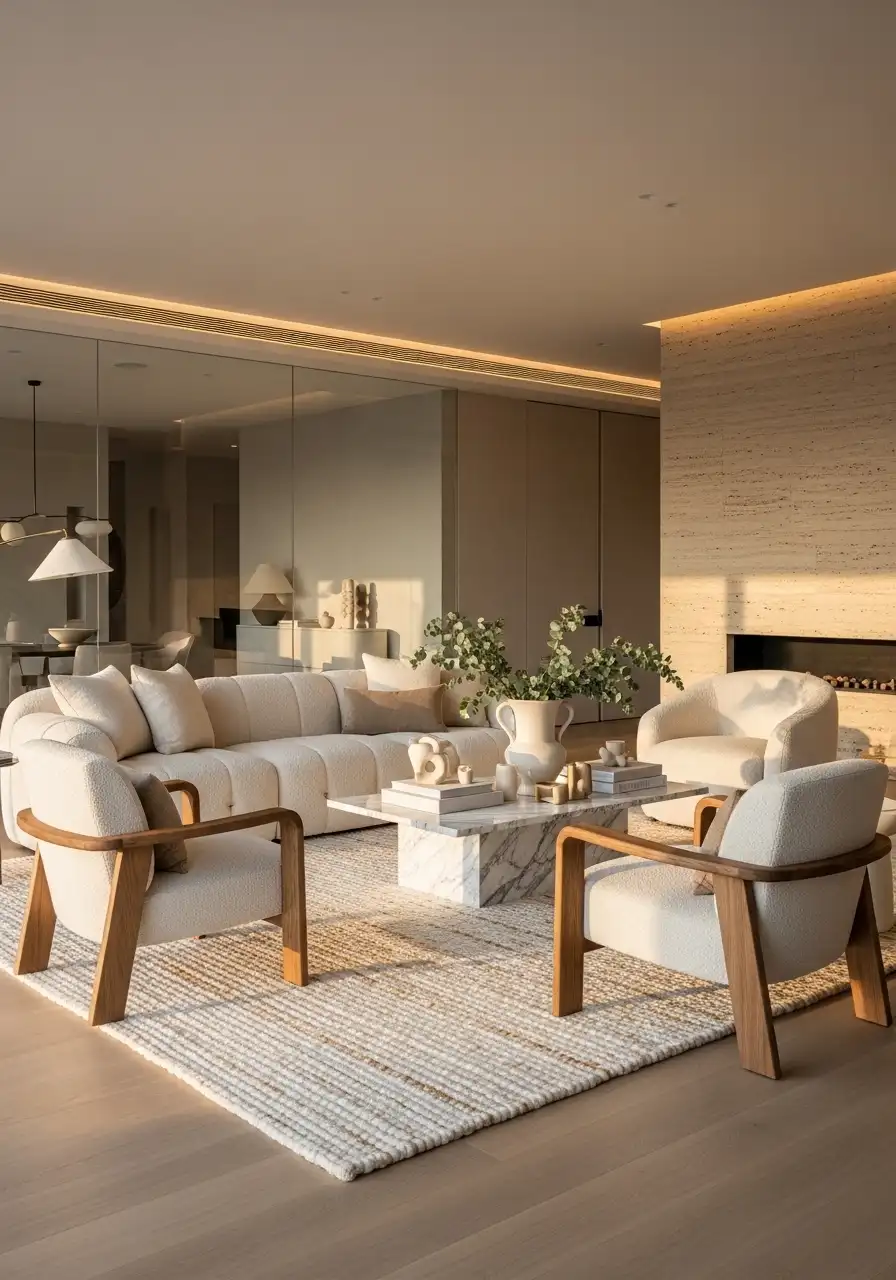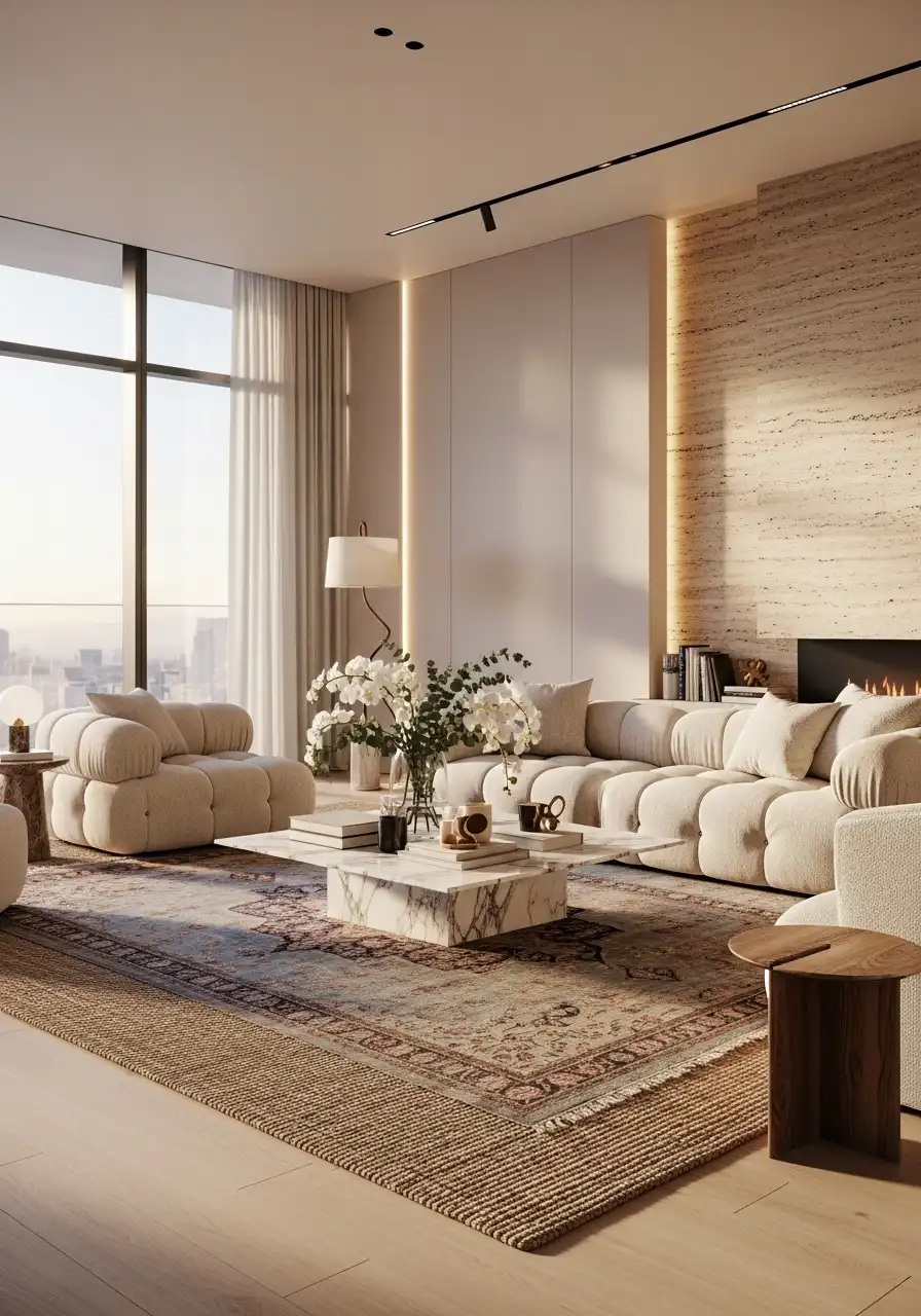 A large soft rug extends beyond the entire seating area, with all furniture sitting comfortably on it. The space immediately feels calm, balanced, and premium.