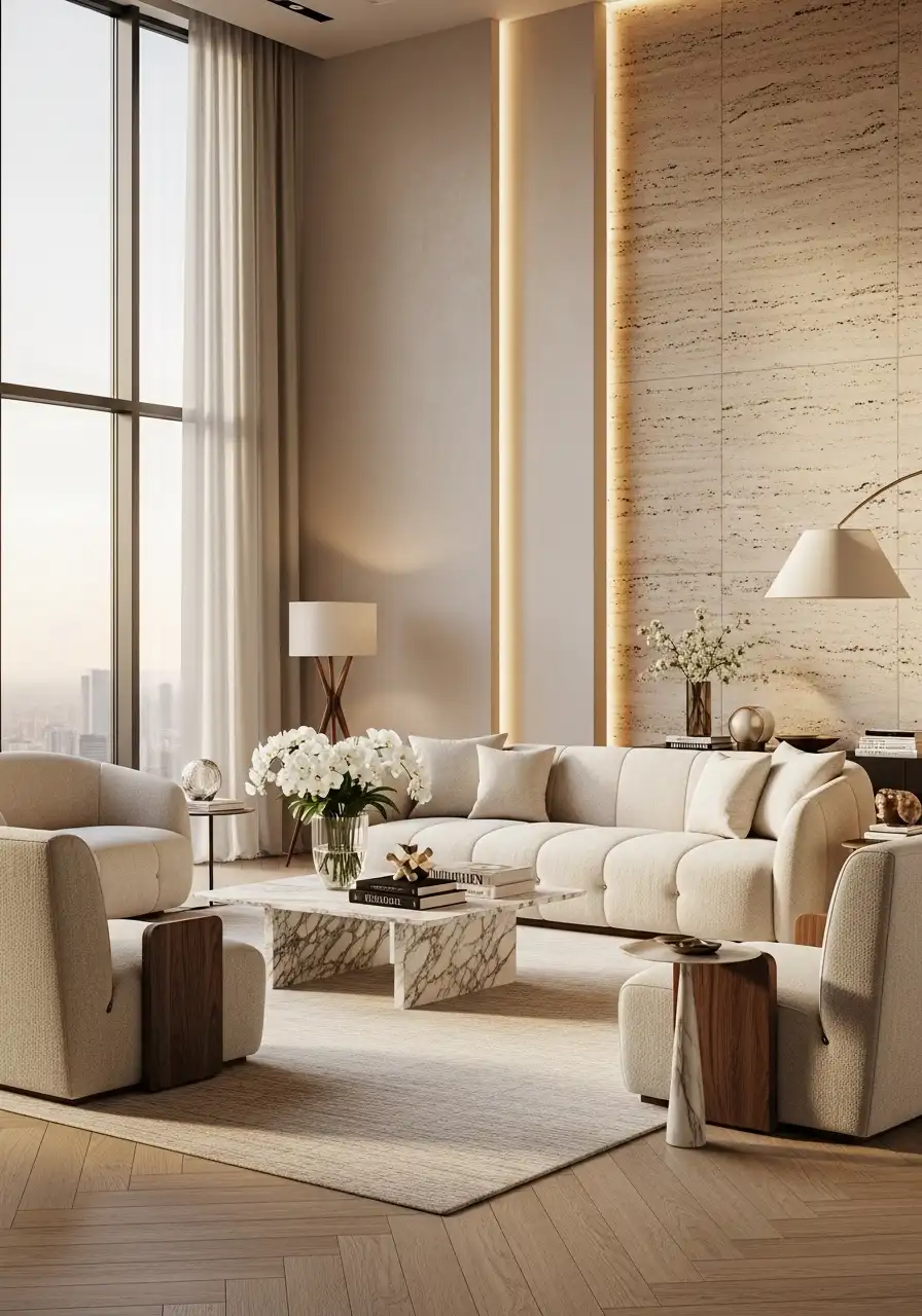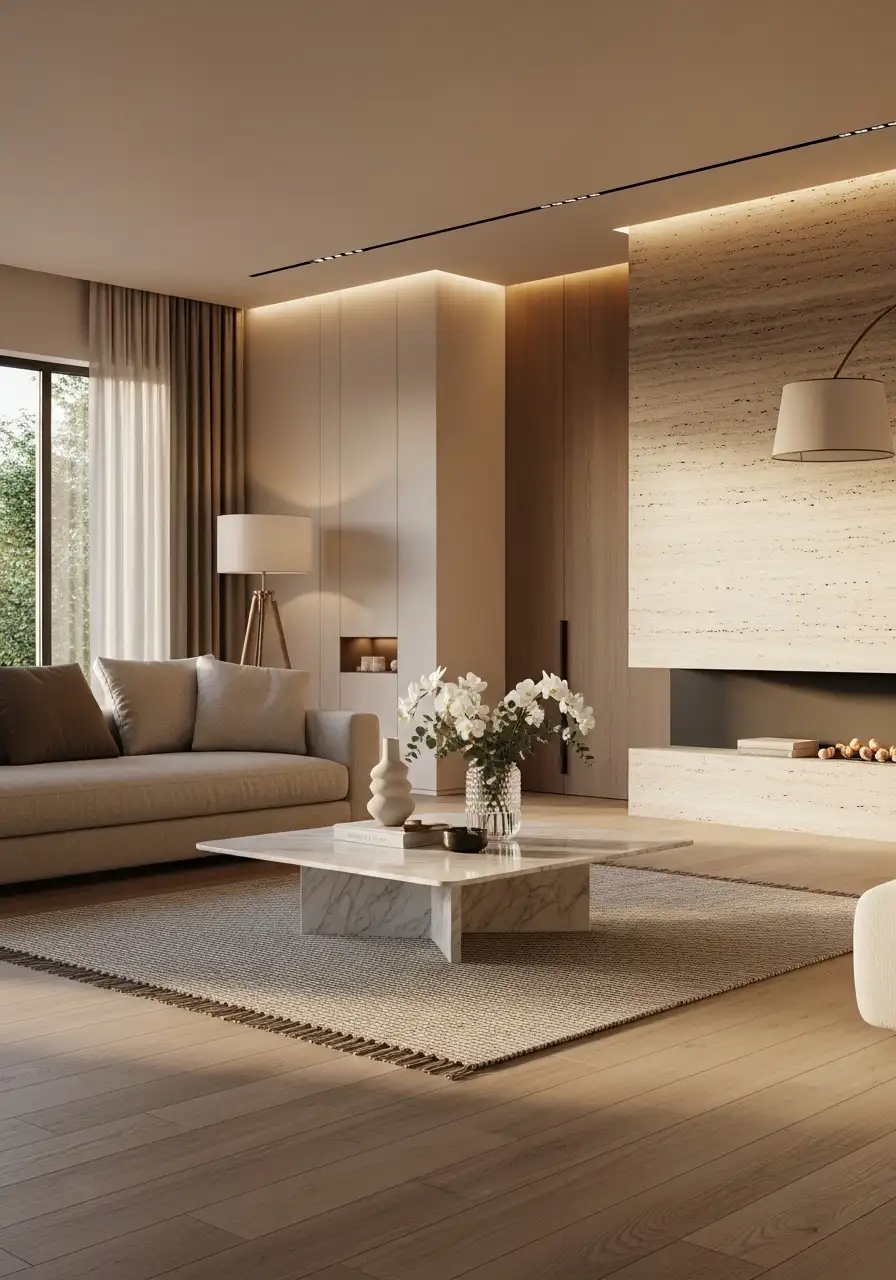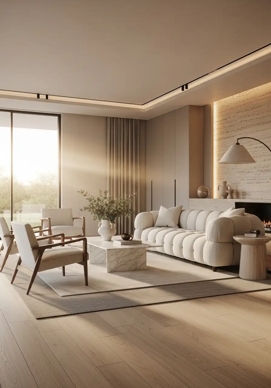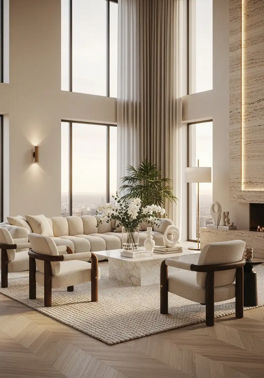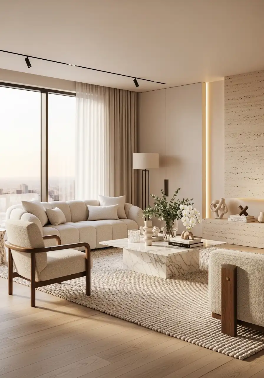 A large soft rug extends beyond the entire seating area, with all furniture sitting comfortably on it. The space immediately feels calm, balanced, and premium.
