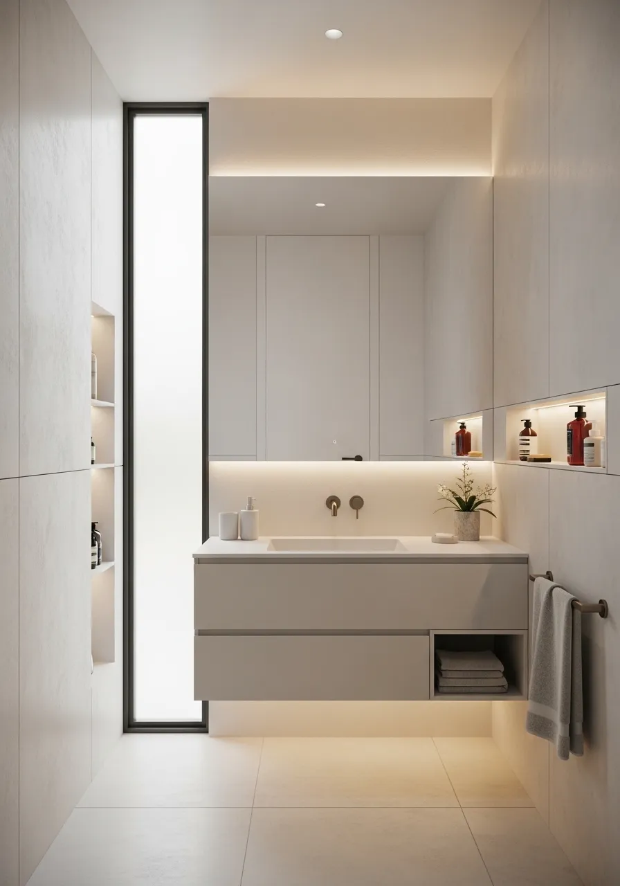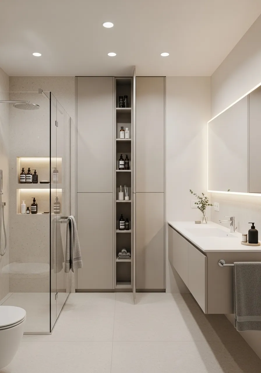 Use built-in niches, vertical shelves, and hidden storage to keep the space organized and clutter-free.