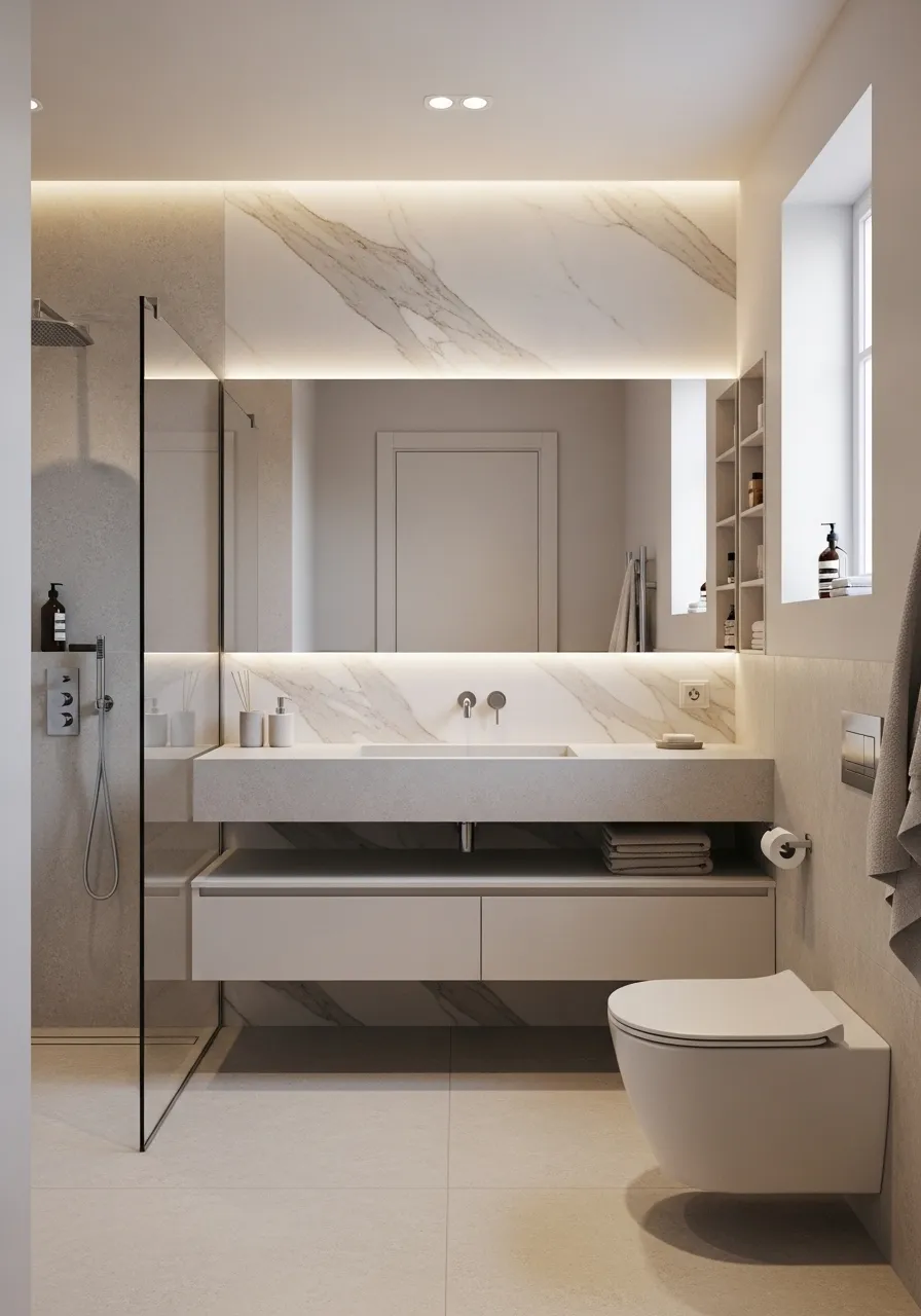 For an even more refined look, you can pair a floating vanity with soft under-cabinet lighting. This small detail adds depth and creates a subtle glow, enhancing the overall atmosphere. It is one of the most effective bathroom decorating ideas to achieve a stylish and balanced modern bathroom decor without overwhelming the space.