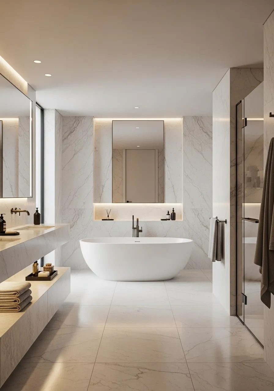 Modern bathroom decor trends featuring a luxury white marble freestanding tub, a floating wood vanity with an LED backlit mirror, and integrated recessed wall shelving. The neutral spa-inspired space includes floor-to-ceiling sheer curtains, marble flooring, and lush indoor plants