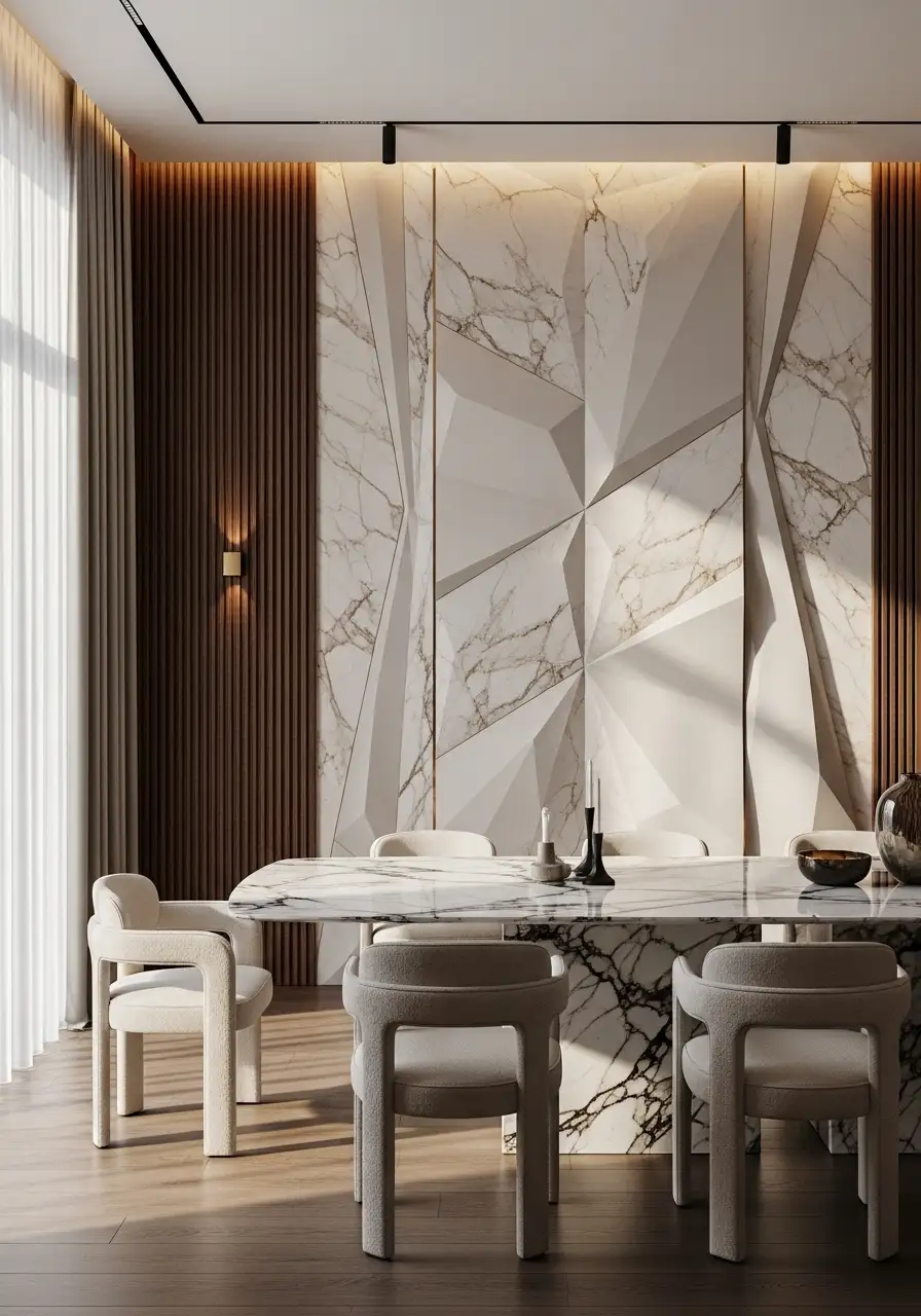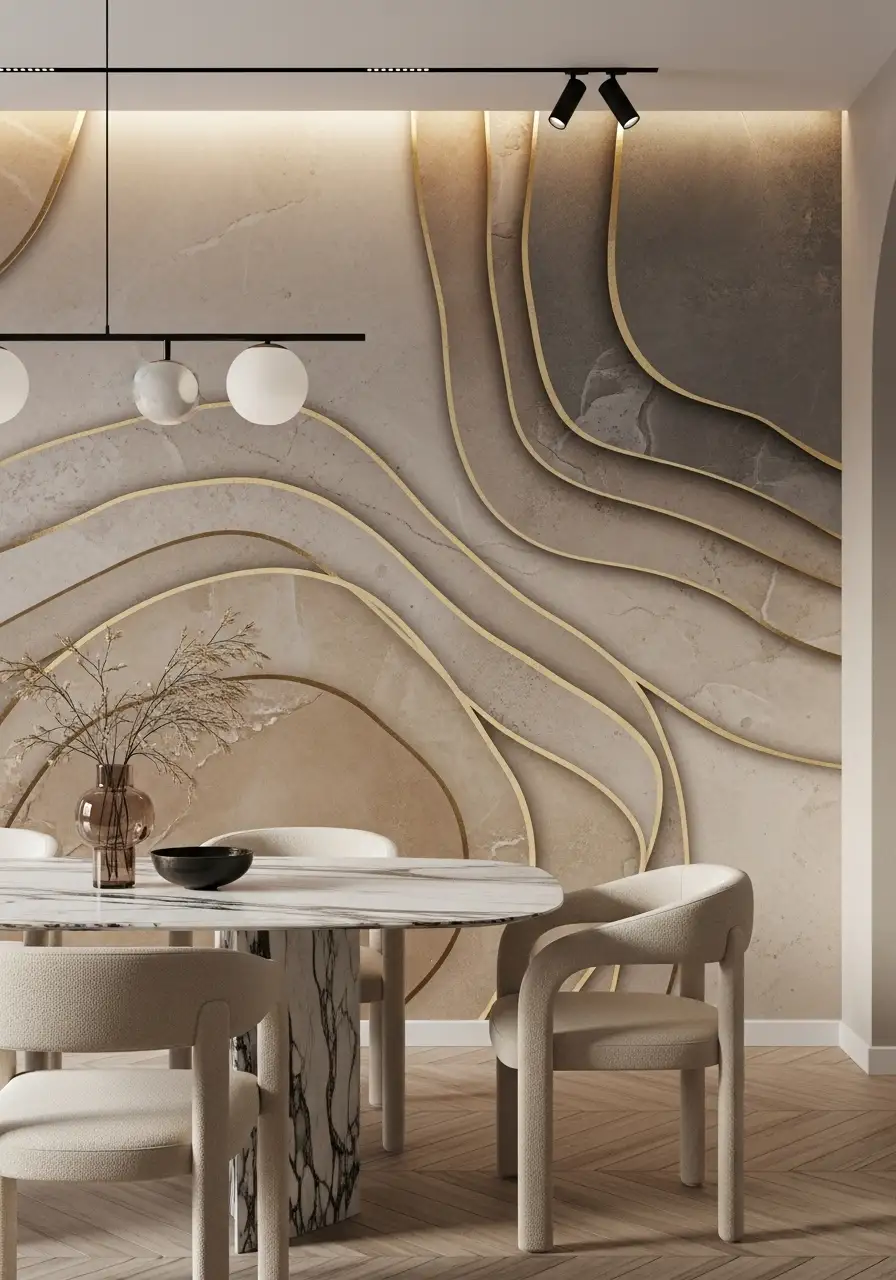 Textured walls are a key trend in modern interiors, making them one of the most effective dining room wall decor solutions. They instantly add depth, dimension, and a sense of sophistication to your dining space.