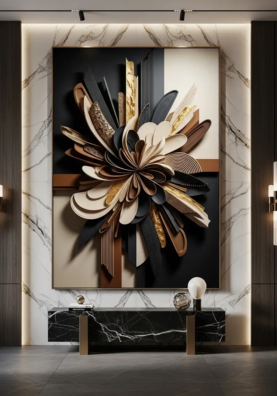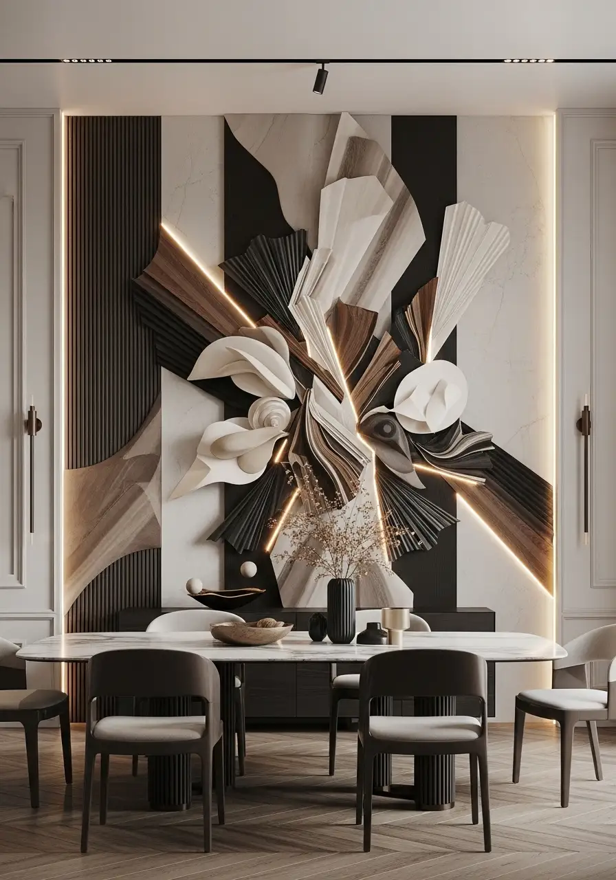 Sculptural decor adds texture and dimension to your wall, creating a high-end designer feel. It transforms a simple dining wall into a focal point that feels both artistic and thoughtfully curated.