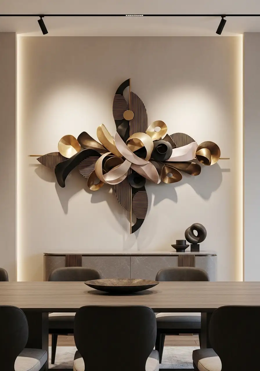 Sculptural wall decor is a unique and modern approach when exploring dining room wall decor. Instead of traditional flat artwork, it introduces dimension and artistic form, instantly making your wall more dynamic and visually interesting.