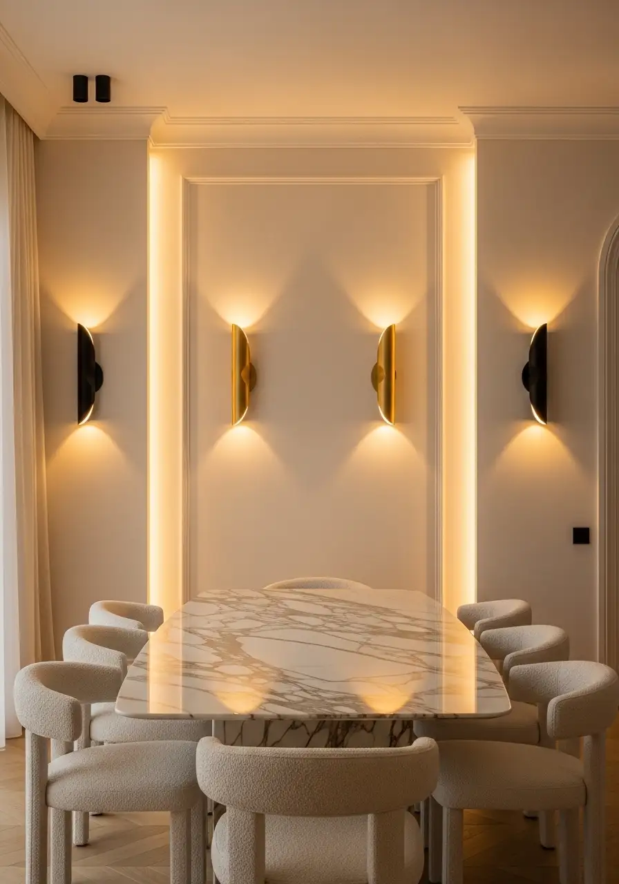 A luxury dining room featuring elegant white wall moulding with rectangular panels and wainscoting. The wall is decorated with modern gold cylinder wall sconces, creating a sophisticated backdrop for a large marble dining table and cream-colored chairs.