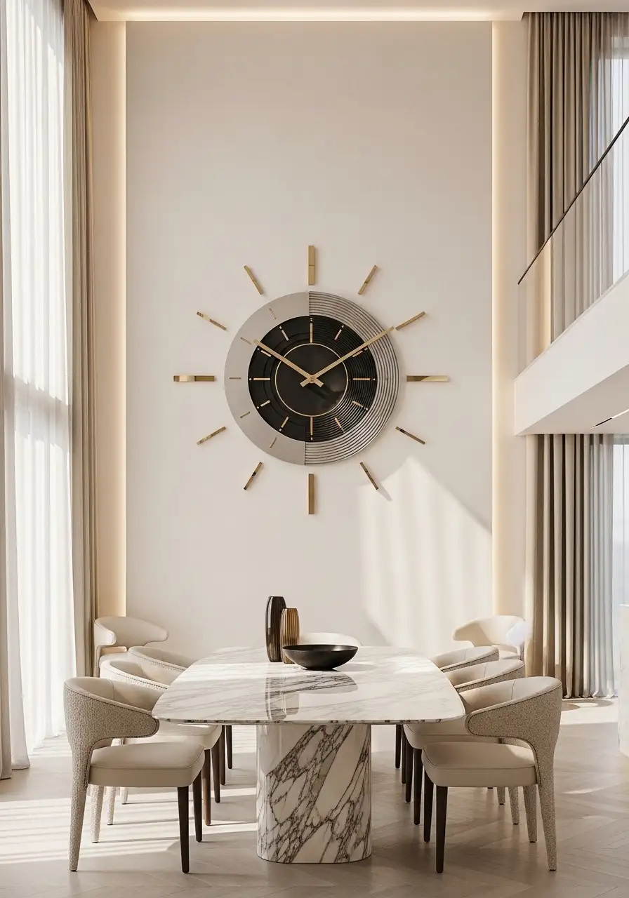 This idea is perfect if you want a subtle yet impactful way to enhance your dining room without overwhelming the space. A well-chosen clock can instantly elevate the overall aesthetic while maintaining simplicity.