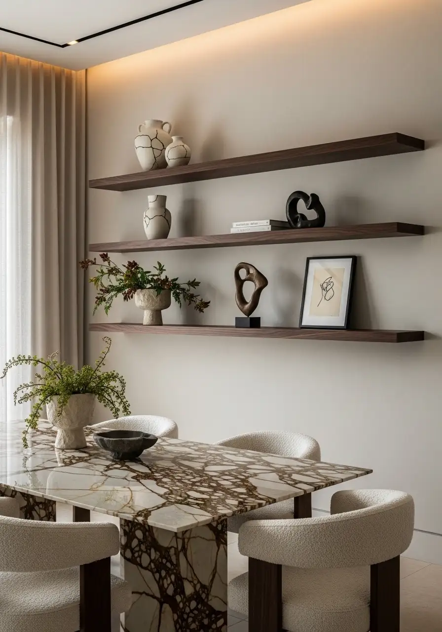 When styled thoughtfully, floating shelves can make your dining wall feel curated and modern without overwhelming the design. They are perfect for adding personality while maintaining a clean look.