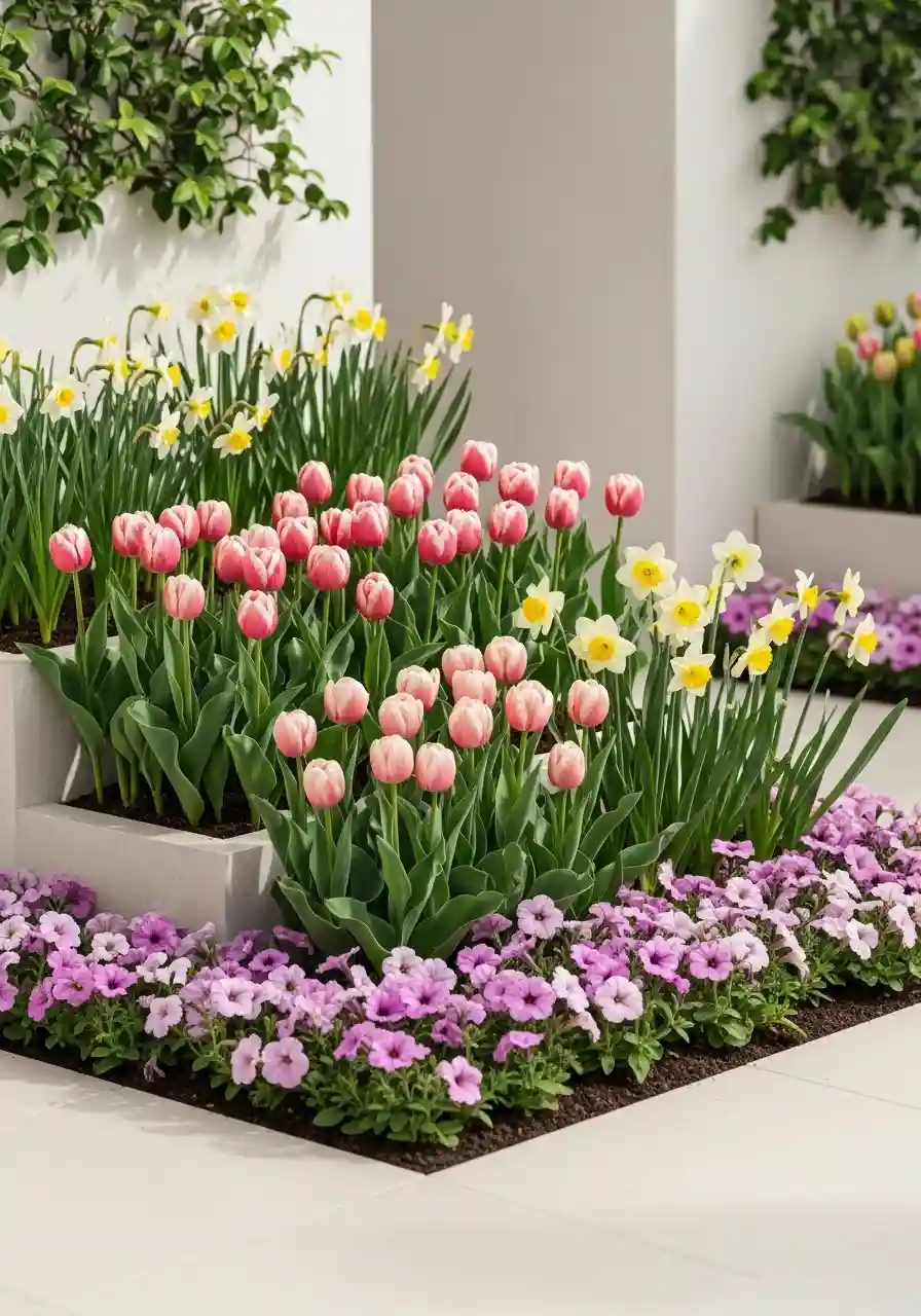 Seasonal flowers like tulips, daffodils, petunias, and pansies are ideal. Mix colours and heights for visual interest and a structured, lively look.