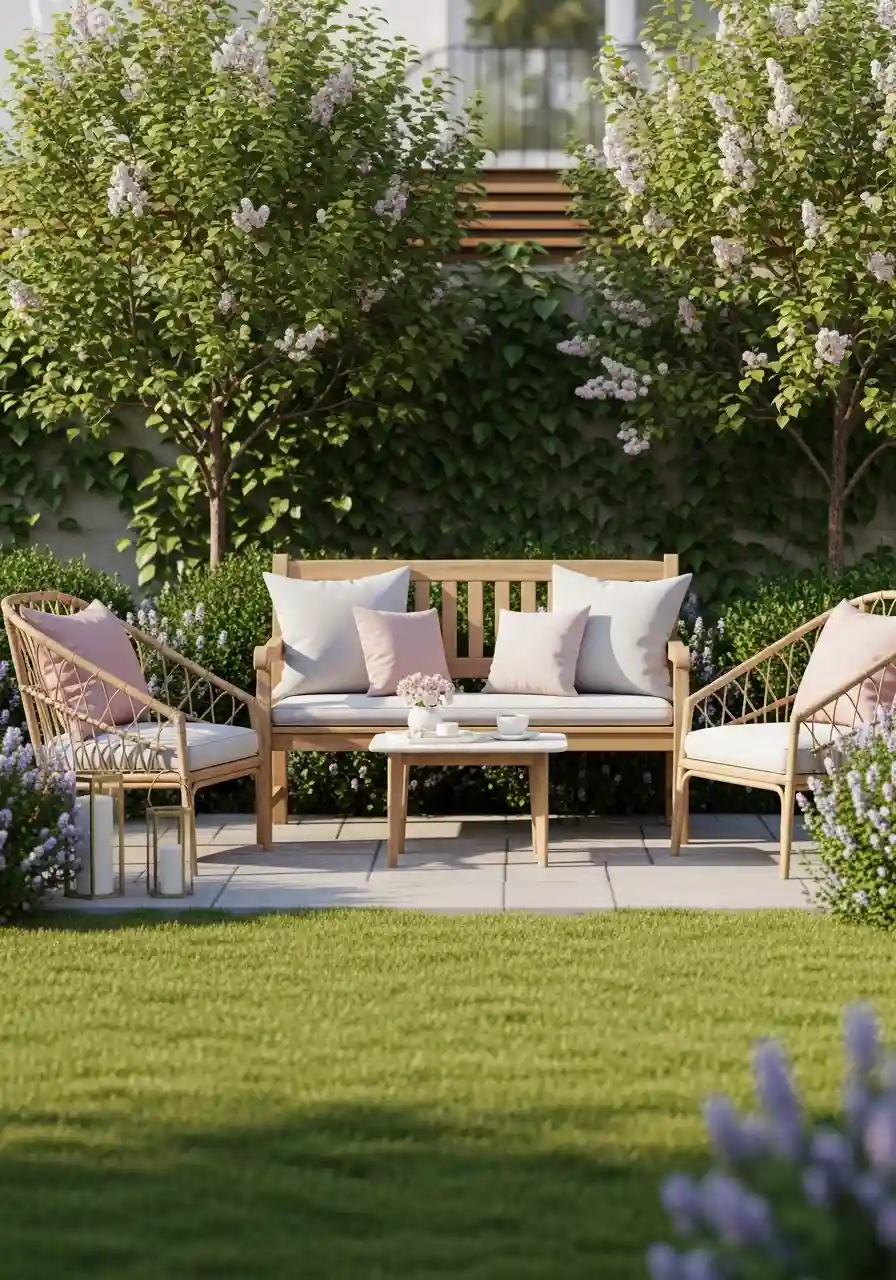 Use materials like wood, rattan, and stone. They add warmth and structure while blending beautifully with greenery.