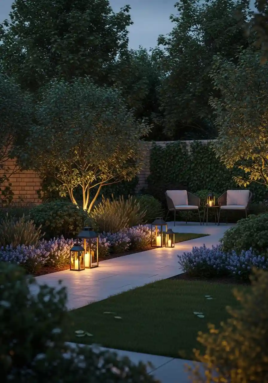 Use warm string lights across pergolas, fences, or trees. Add garden lanterns along pathways or seating areas. Layering different sizes creates a magical and inviting ambience.