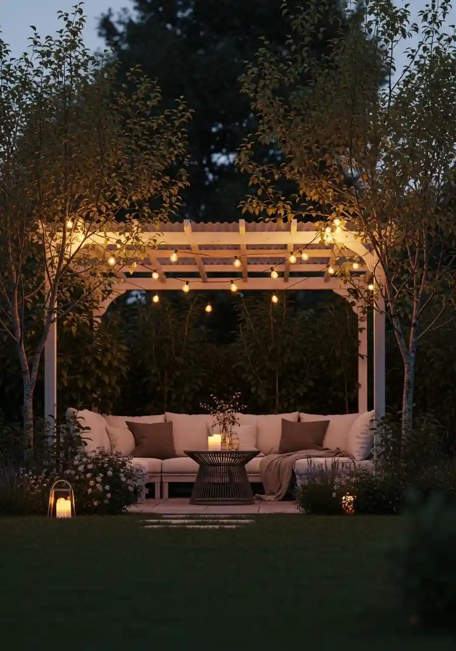 Drape warm string lights across fences, pergolas, or trees. They create a soft, inviting glow that instantly adds charm.