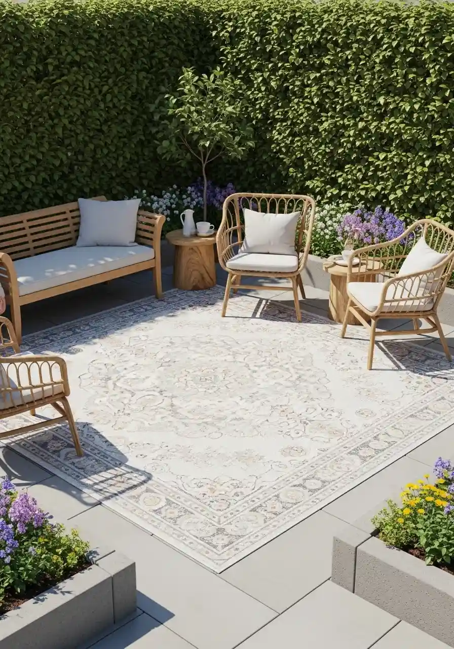 Outdoor rugs are no longer just for indoors. They instantly add warmth and style to any garden corner.