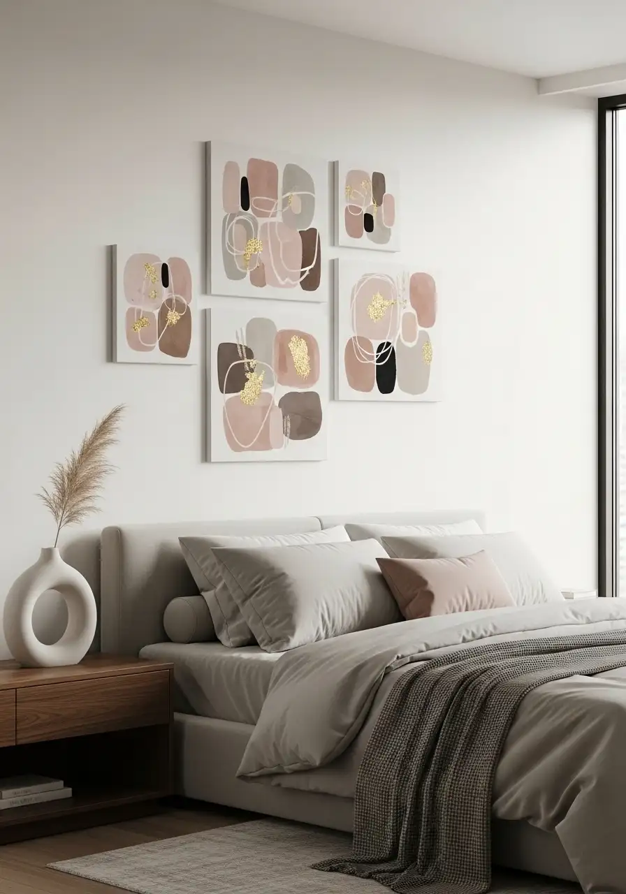 For a sleek, modern vibe, minimalist wall art is ideal. Choose black-and-white prints, abstract designs, or soft typography for wall decor ideas for a bedroom.
