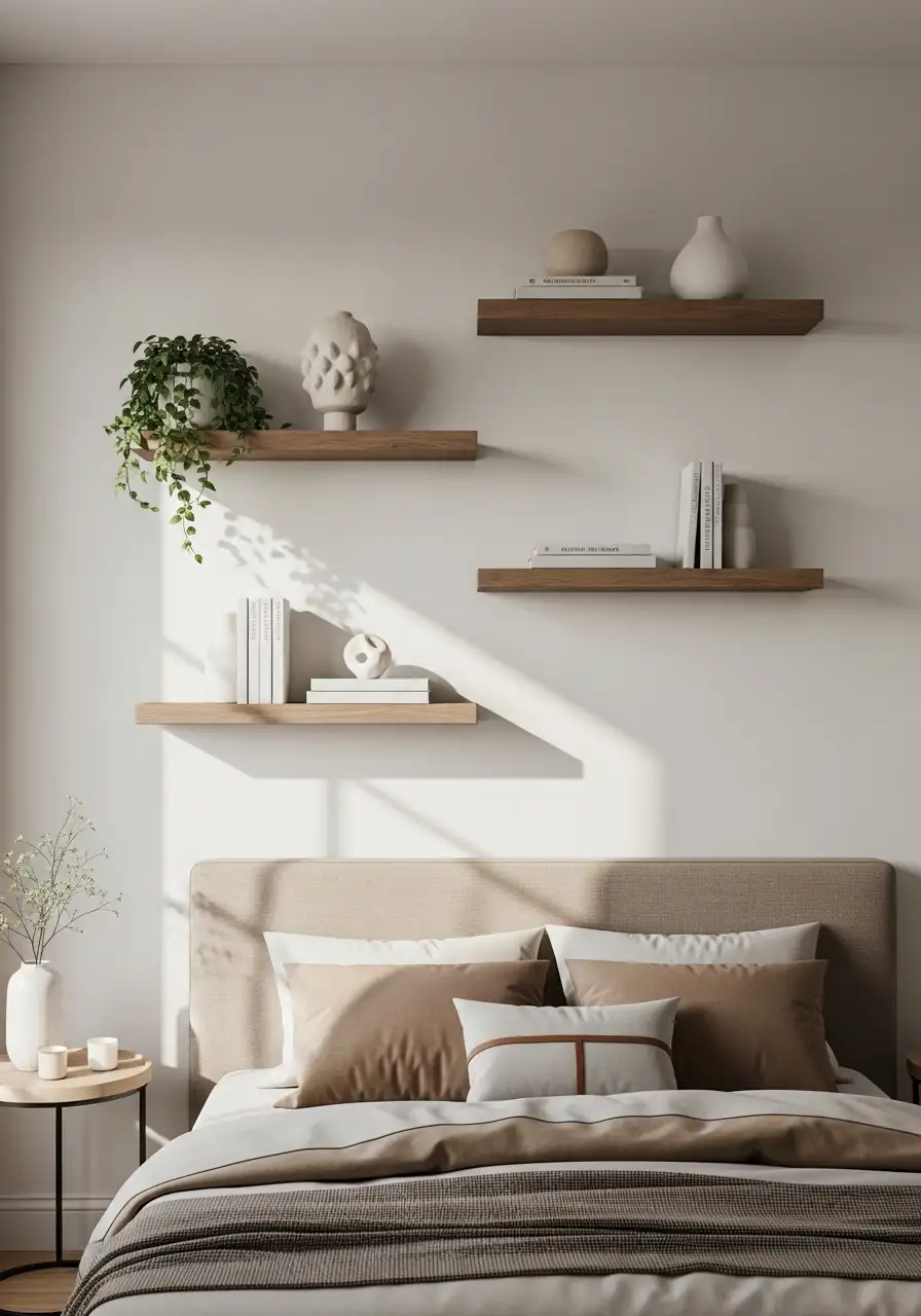 Floating shelves aren’t just for storage—they also make stunning wall decorations for bedroom. Use them to display plants, small sculptures, or books. This adds depth and personality to your walls instantly.