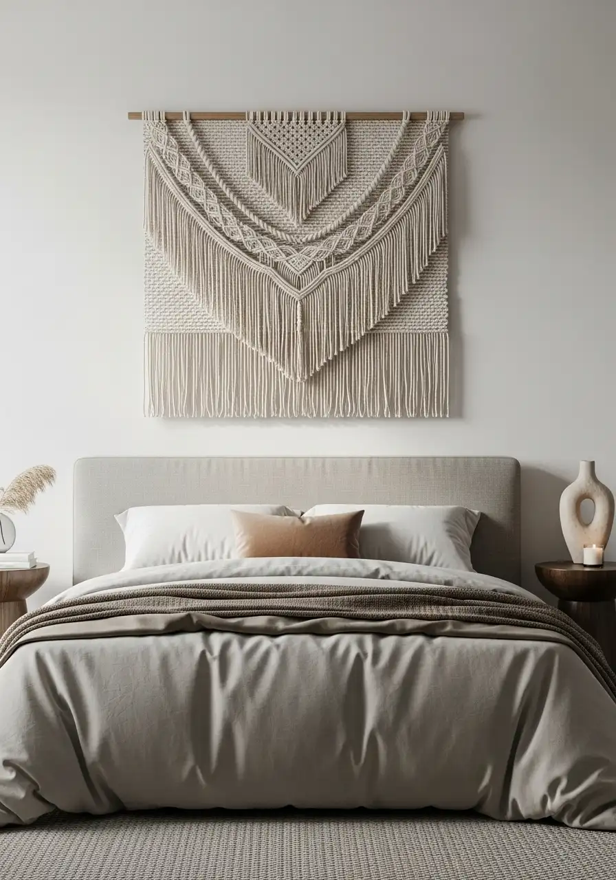 Add warmth and softness with textile wall hangings like macramé or woven tapestries. These pieces make excellent wall decoration for the bedroom and instantly create a cozy vibe.